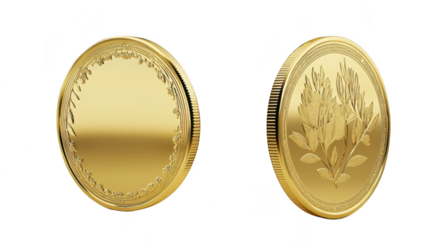 A pair of shiny gold coins featuring intricate designs. one side adorned with floral patterns and the other side plain. set against a clean white background. ideal for financial or investment-themed u