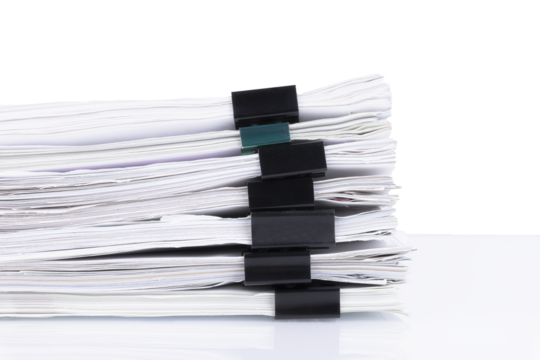 A stack of papers in the office on a white table, Transparent background. PNG.