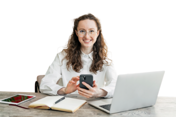 A woman with glasses uses a workplace phone, a financial analyst student, transparent background, png.