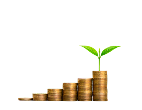 Plant growing from gold coin stacks representing financial growth and investment succ