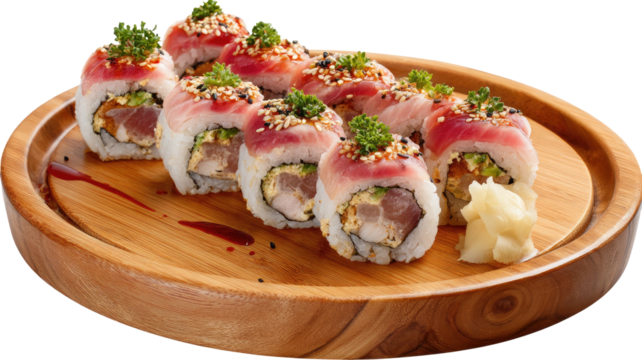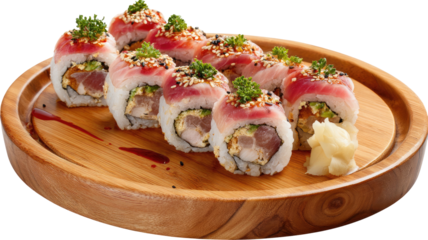 Sushi roll slices with tuna, seaweed, and rice served on wooden platter