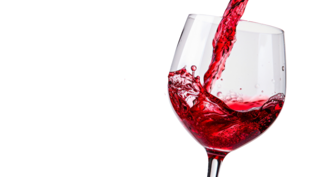 Red wine pouring in glass on white background
