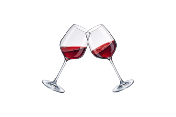 A set of elegant wine glasses toasting, showcasing a deep red wine with a delicate wine splash effect.