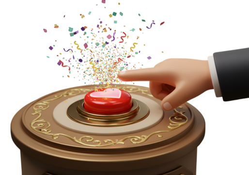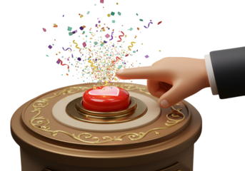 3D Illustration of Hand Pressing a Red Button with Confetti Burst on Transparent Background