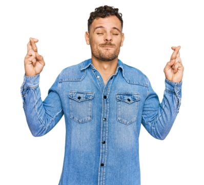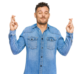 Young hispanic man wearing casual denim jacket gesturing finger crossed smiling with hope and eyes closed. luck and superstitious concept.
