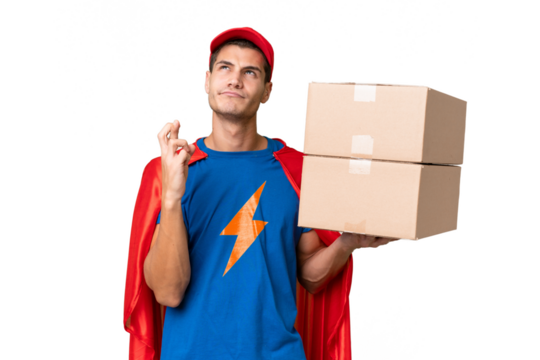 Super Hero delivery man over isolated background with fingers crossing and wishing the best