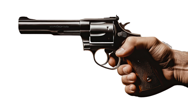 A hand holding a pistol against a white background, symbolizing danger and crime