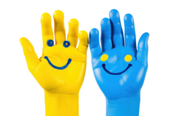 A pair of hands with vibrant smiley faces drawn on the palms, showcasing an assortment of emotive expressions from happiness to playfulness.