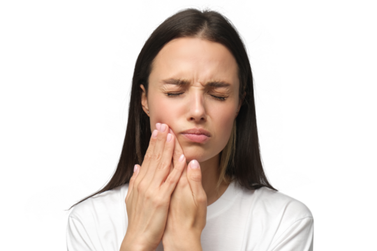 Portrait of a smiling woman with hand on her cheek looking ahead on transparent background