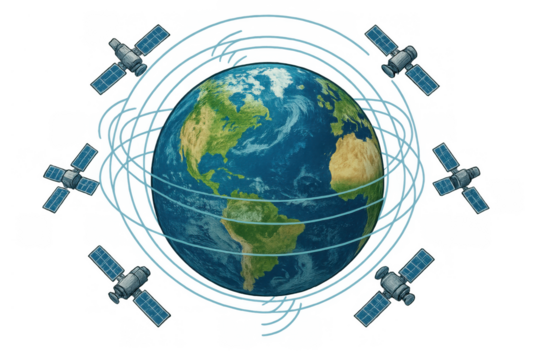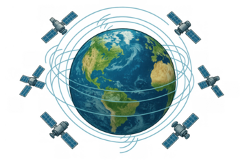 Earth surrounded by orbiting satellites beaming global communication and internet signals across the world