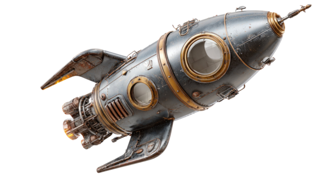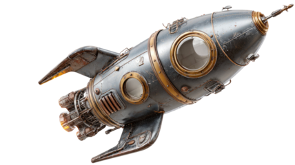 Vintage retro metal rocket spaceship with porthole windows riveted body detailed sci fi spacecraft isolated