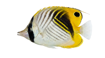Close-up shot of a vibrant butterflyfish with yellow, black, and white stripes on a solid white background.