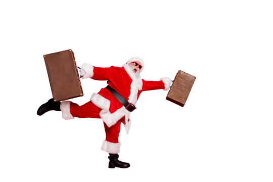 Full length body size view of nice attractive cheerful fat bearded man carrying vintage heavy bags luggage baggage flight tourism isolated on bright vivid shine red background
