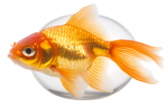 A vibrant orange goldfish with flowing fins swimming gracefully in a clear water bubble isolated on transparent background