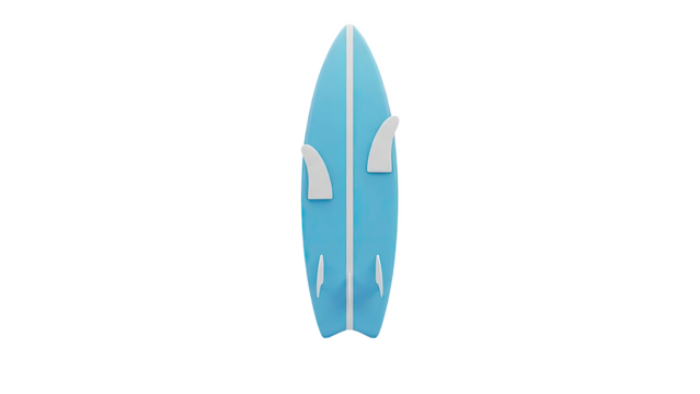 Blue surfboard with white fins on a white background