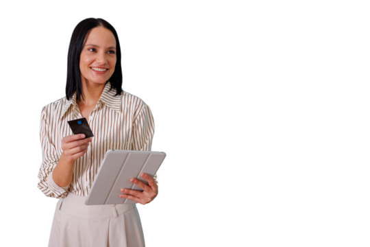 Woman holding credit card and tablet, smiling, enjoying online shopping and e-commerce payment technology