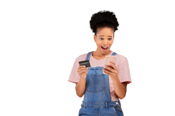 Happy woman, mobile app and credit card for e commerce, fintech or digital banking on web. Female model, excited or wow emoji with tech for online shopping on isolated or transparent png background