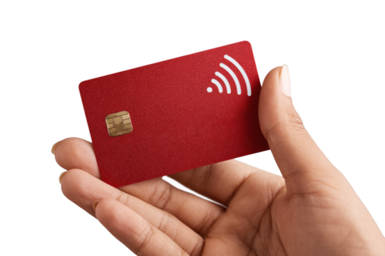 open hand holding a credit card with contactless waves, fintech payment concept, white background
