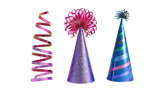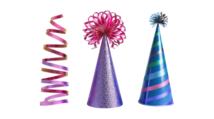 Collection Of Mixed New Year'S Party Hat Noise Maker And Streamer For Festive Celebration Ads And Promotions isolated on transparent background. Generative ai