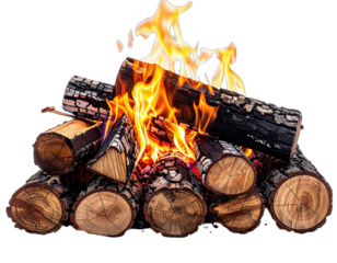 A vibrant bonfire is comprised of logs and bright flames, with a transparent background