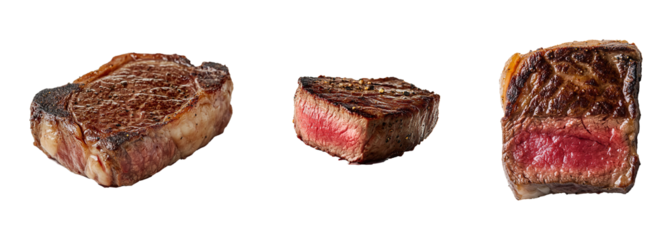 Grilled beef steaks with grill marks and dripping juices floating, appetizing barbecued meat cut out on transparent background