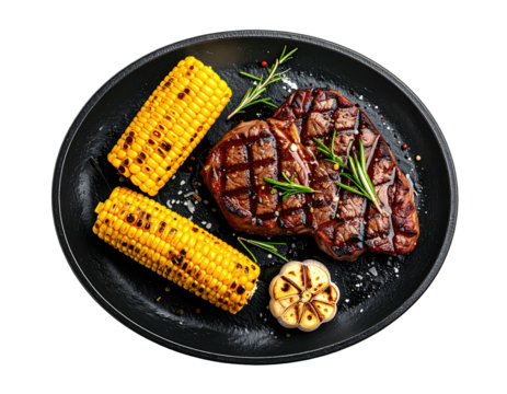 Grilled steak, corn, garlic on black plate