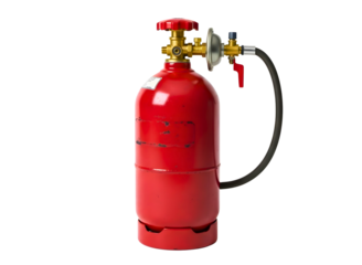 Red fire extinguisher with a flame symbol on a transparent background