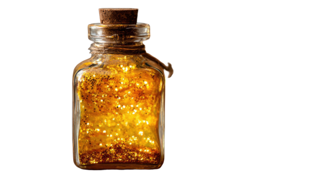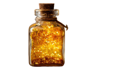 glowing glass bottle filled with golden glitter lights,magical sparkling jar photography isolated on white background