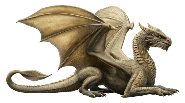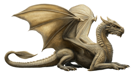 Golden Fantasy Dragon Isolated on Transparent Background, Mythical Creature with Wings, Detailed 3D Illustration, Medieval Legend, Magical Beast Concept Art