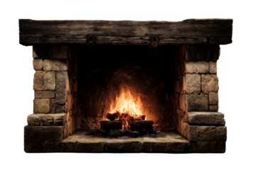 Stone fireplace with burning logs.  Transparent PNG. Cozy hearth with crackling fire and stacked firewood. Isolated on transparent background, png