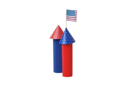 Three american flag themed fireworks rockets standing upright above a red ribbon banner with 4th july text isolated on transparent background