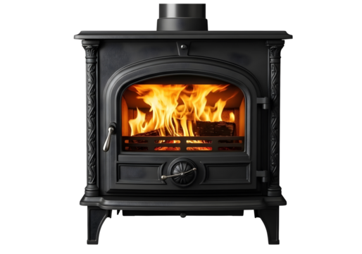Black wood burning stove with fire isolated on transparent background