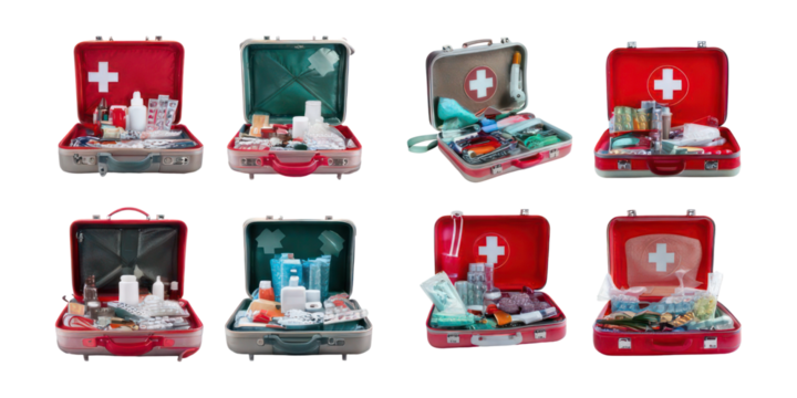 First Aid Kits with Medical Supplies and Equipment,PNG set collection, isolated on transparent background