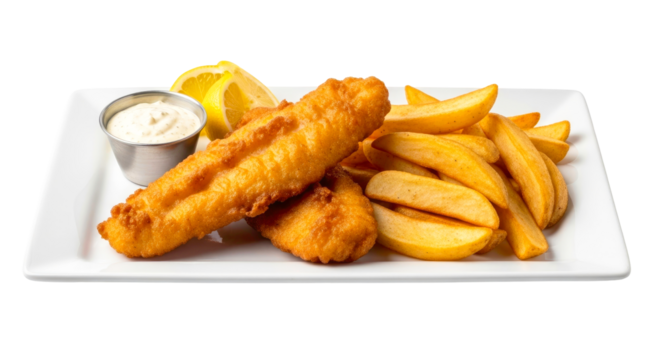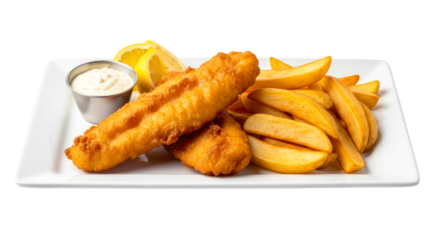 Traditional fish and chips with golden crispy fish fillet and fries isolated on white or transparent, PNG