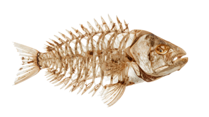 Fish skeleton isolated on transparent background, showcasing the intricate bone structure and anatomy of the animal, revealing the delicate spine and the natural design of the remains