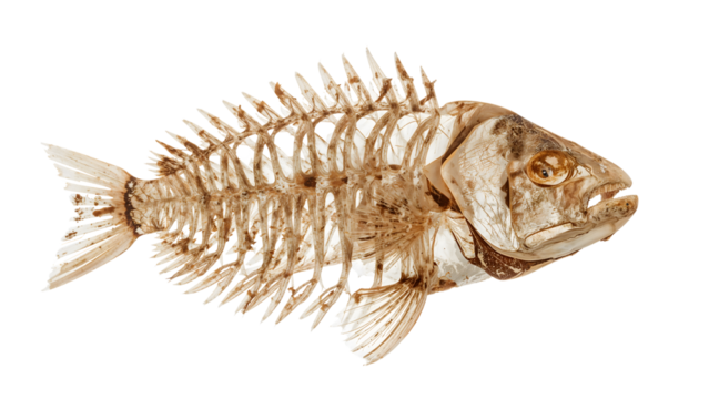 Detailed fish skeleton isolated on the transparent background showing bones, fins, and structure for anatomy, education, and science concepts