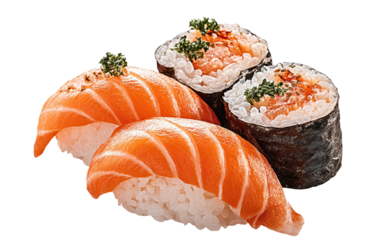 Sushi rolls and nigiri served on a plain background with alternating fish and rice arrangements