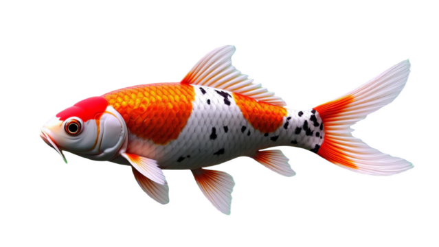 Kohaku Koi fish isolated PNG, white and orange carp swimming on transparent background, Japanese ornamental fish for aquariums and ponds