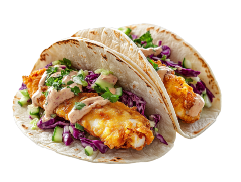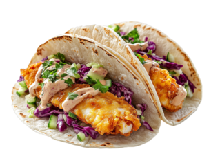 Crispy fish tacos with red cabbage slaw, spicy sauce, and fresh cilantro on a transparent background, ideal for Mexican cuisine and seafood lovers