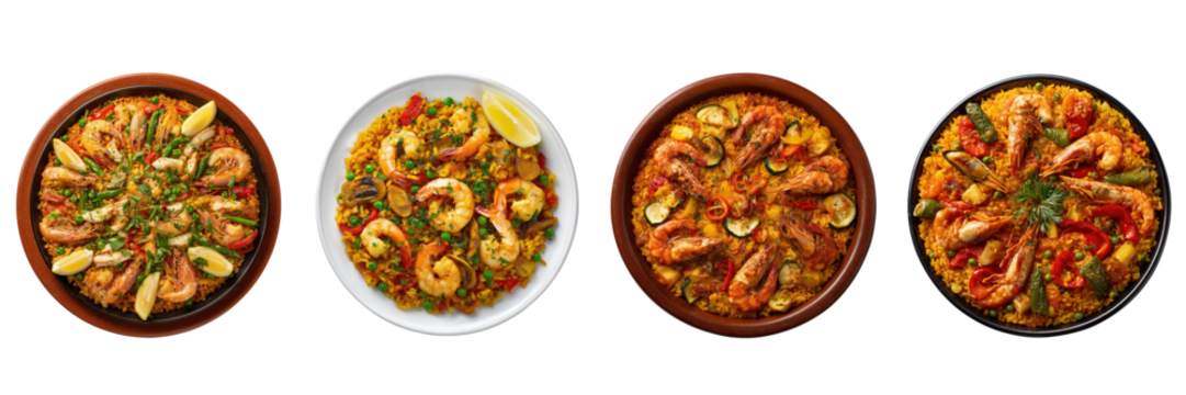 Set of Delicious seafood paella with prawns and vegetables on a plate top view isolated on a transparent background