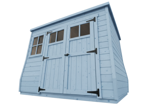 hyperrealistic small garden shed model of pale cornflower blue shiplap wood, matte black hardware, isolated high-key on white studio background with fisheye distortion concept for product