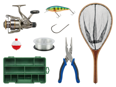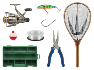 Fishing Gear Still Life on White Background: Ready for a Day on the Lake
