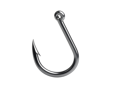 A sharp fishing hook, isolated on a white background, representing fishing and outdoor hobbies.