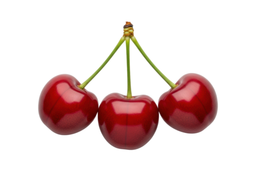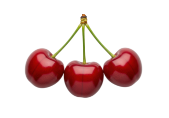 Three plump, deep red Bing cherries with green stems on a seamless transparent background, ultra photorealistic close-up, soft studio lighting, macro detail, concept of fresh fruit perfection