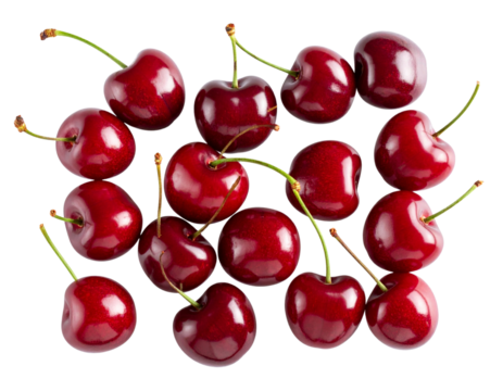 Organic Burgundy Bing Cherries with Stems, Top View, isolated on a transparent background.