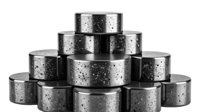 Uranium fuel pellet stack, metallic gray texture, clean white background