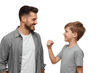 Joyful father and son bonding, playfully engaging in a fist bump against a transparent backdrop