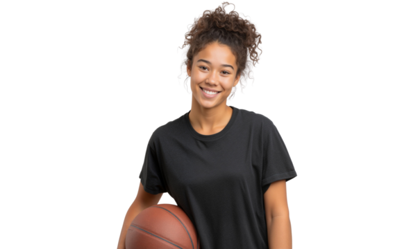 Smiling young mixed-race woman with curly hair, holding a basketball ready for the game, isolated on transparent background