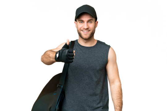 Young sport man with sport bag over isolated chroma key background with thumbs up because something good has happened