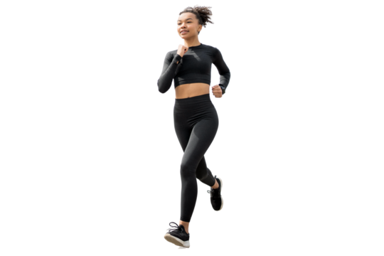 Runner Woman jogging full-length fitness running shoes and workout suit,  isolated transparent background.